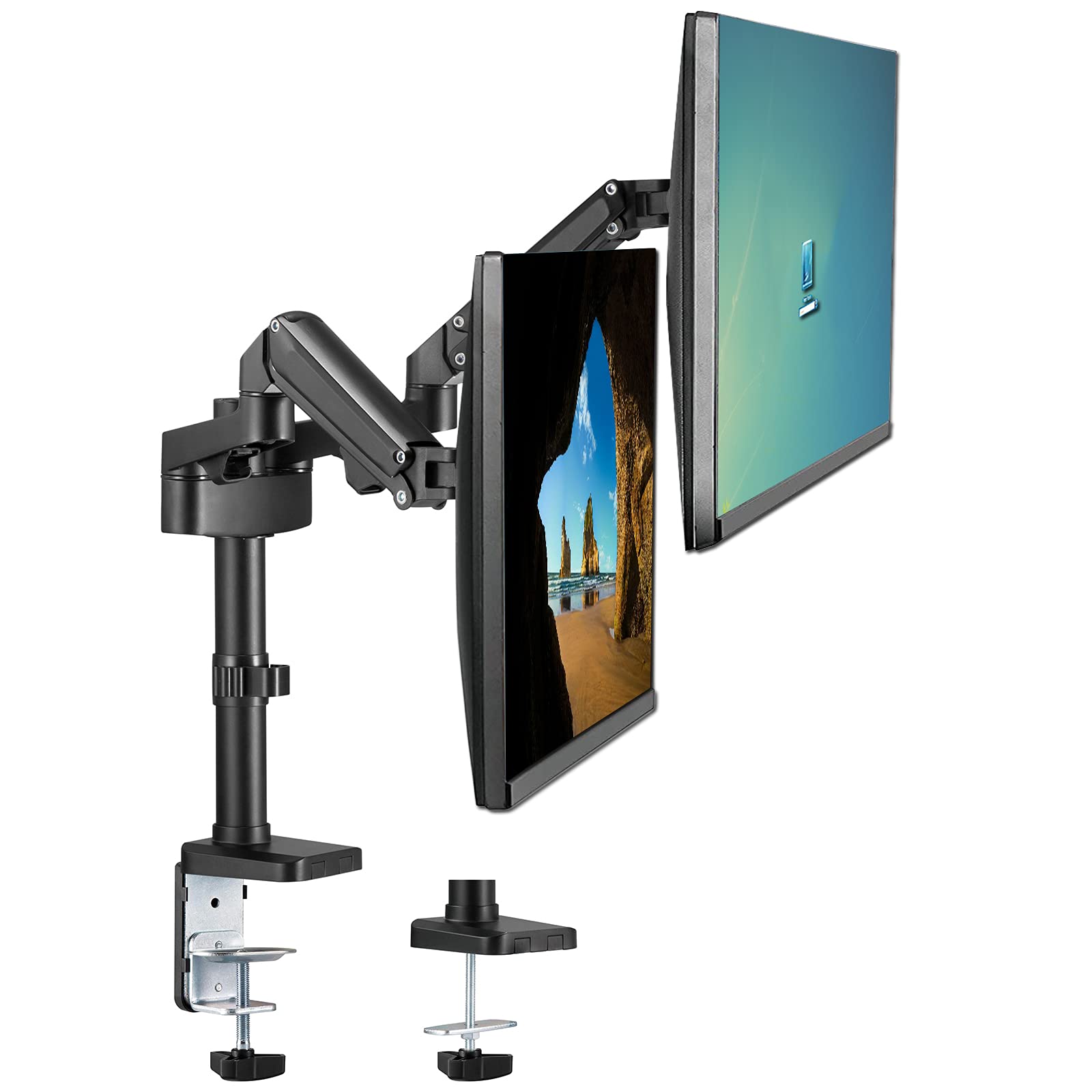 . Supporting monitors up to 27", this fully adjustable desktop stand enables positioning of your monitors for improved posture and productivity Professional Space Saver - The dual monitor mount with cable management, conceals wires within arms and frees up more desk space by holding 2 monitor arms.
